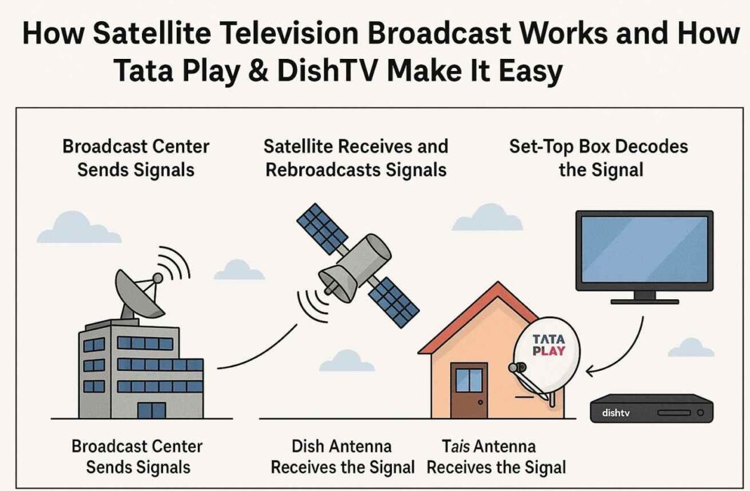 Now we will explore how satellite television broadcast processes work. Step by step we will explore how tata play makes it easy for every Indian & accessible from anywhere. That doesn’t matter where you are living in a city, village, hill station or any island, tata play has their services everywhere in india.